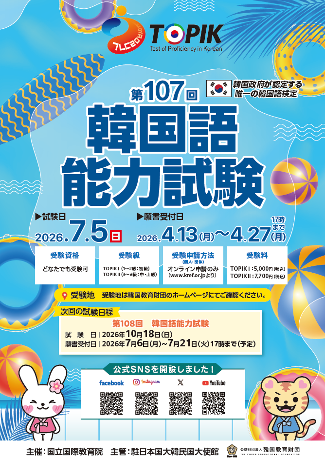 第107回TOPIK(韓国語能力試験)申込について下記の通りお知らせいたします。