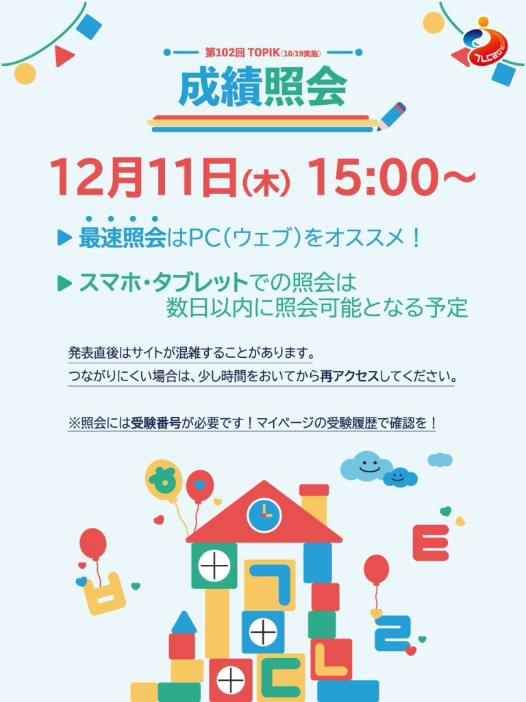 10月19日に実施しました第102回TOPIK(韓国語能力試験)の結果発表は12月11日(木)の15時からとなります。